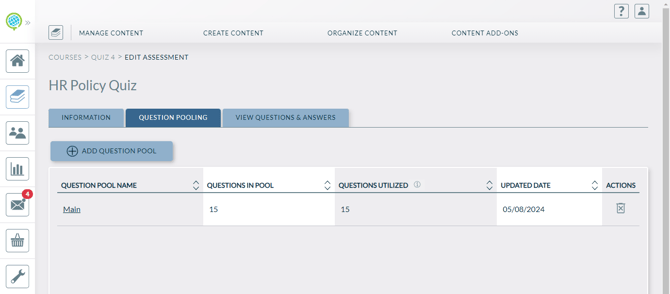 The above quiz was created via a document, so the "Main" pool which is the default, already has the 15 questions that were generated from that document. If necessary, a second pool could be created with different questions to provide more variety for the quiz. Select "add question pool" and give it a name, and it will list under the main pool.