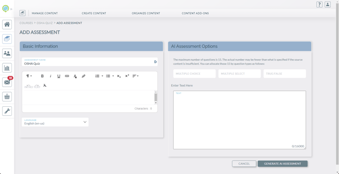 The Assessments work by inputting content to create a question bank that your learners can take, whether documents, text, or manually creating questions. In the case of documents and text, the LMS will use AI to automatically create questions and answers for the assessment. This assessment can be assigned to learners for them to take. Even better, these assessments have their special reports so you can see line by line how a specific learner might have performed.