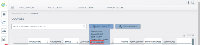 Assessments are located in the content section, and can be created by selecting "Add Course > Assessment".