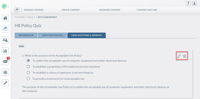 The "View Questions and Answers" on the quiz information will display all questions in a a list form. Utilize the options on the right to edit or delete a question.