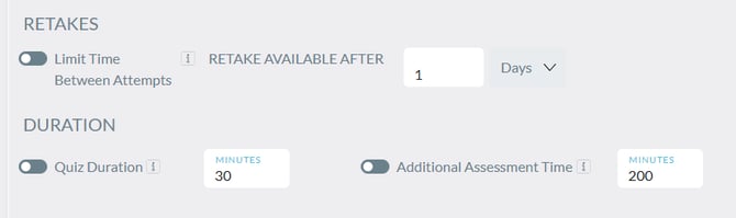- Attempt Limit - The duration controlling how long a learner must wait until attempting the assessment again.