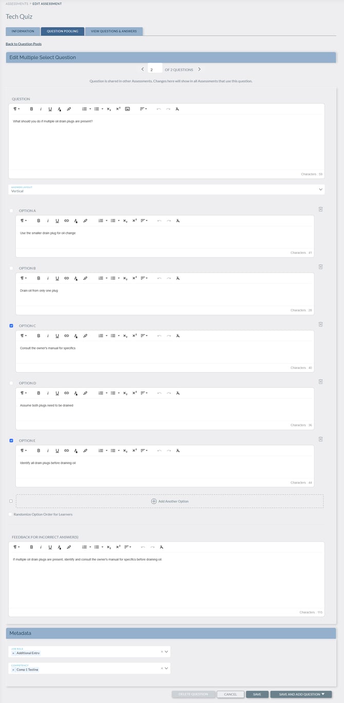 Rich Formatting: Both multiple choice and multiple-select question types support an HTML editor for answers. This allows administrators to apply formatting such as bold, underline, italics, links, lists, and color highlights, increasing clarity and engagement for learners. HTML-formatted answers will appear in assessments, while grids will display plain text versions.
