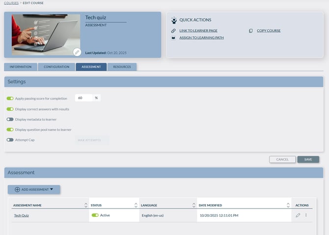 An assessment's layout is similar to other course types aside from the Assessment Tab. This page allows for unique configuration based on what your organization needs for an assessment.