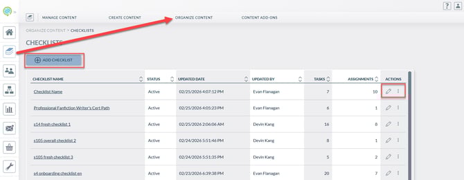 From the admin dashboard, navigate to the Content section, hover over the Organize Content header, and select Checklists section