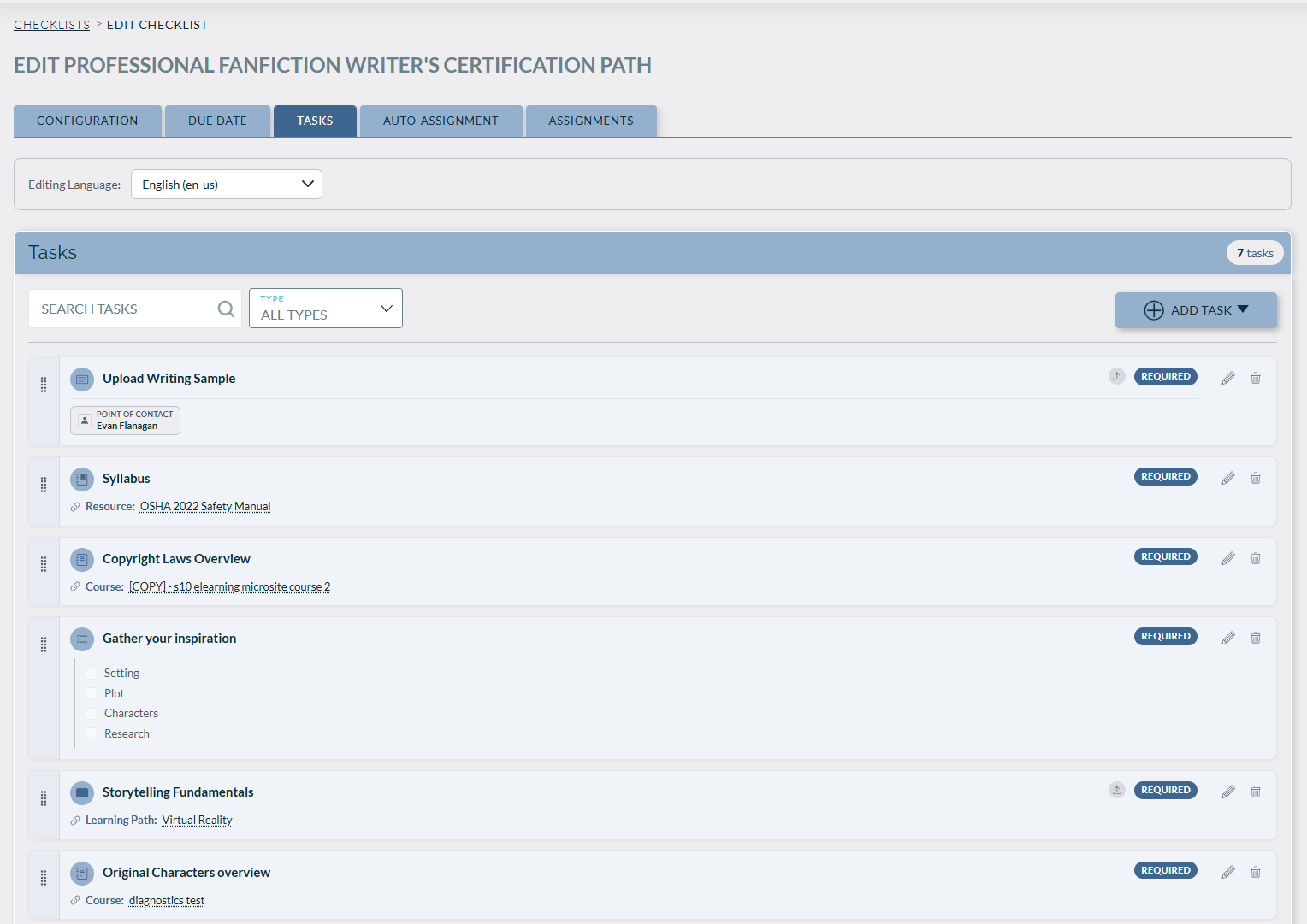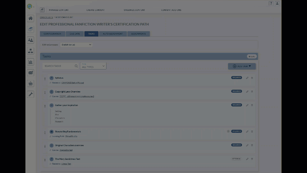 Tasks define the steps learners need to complete. To add tasks: