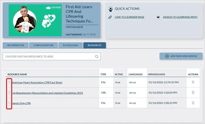 Admins can now reorder resources via drag-and-drop in both Course and Self-Study resource lists, and the updated order is reflected for learners.