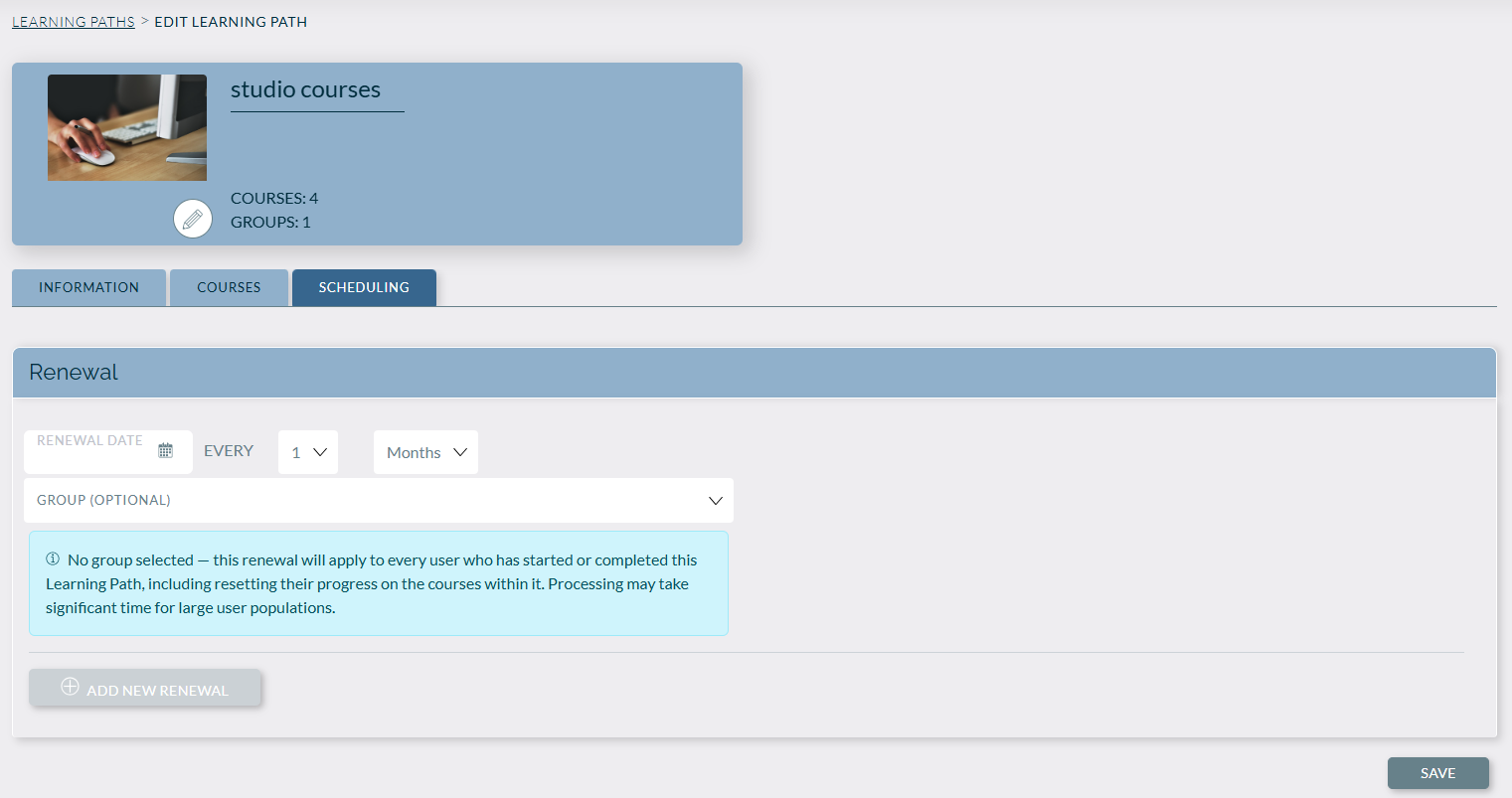 Learning Path (LP) renewals allow admins to schedule automatic recurring renewals on learning paths, mirroring the functionality already available for Courses. When a renewal fires, a learner's LP progress is archived and reset, requiring them to complete the courses again. A new two-page LP certificate is generated showing the renewal completion date alongside a table of the individual course completions within that cycle.