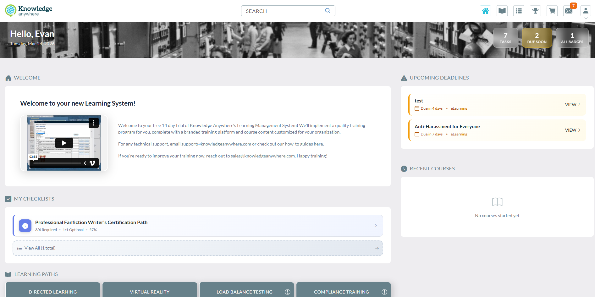 The Learner Homepage has been refreshed with a cleaner, more streamlined design. The updated layout makes it easier for learners to navigate training at a glance, with a dedicated Upcoming Deadlines section so a due date isn't missed, and a new My Checklists area to help track progress. Everything needed is still there, just presented in a more organized, modern way.