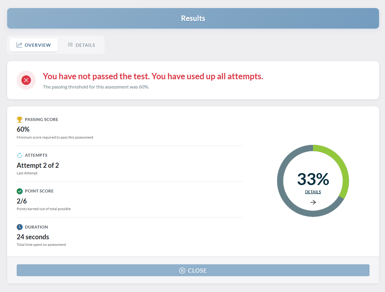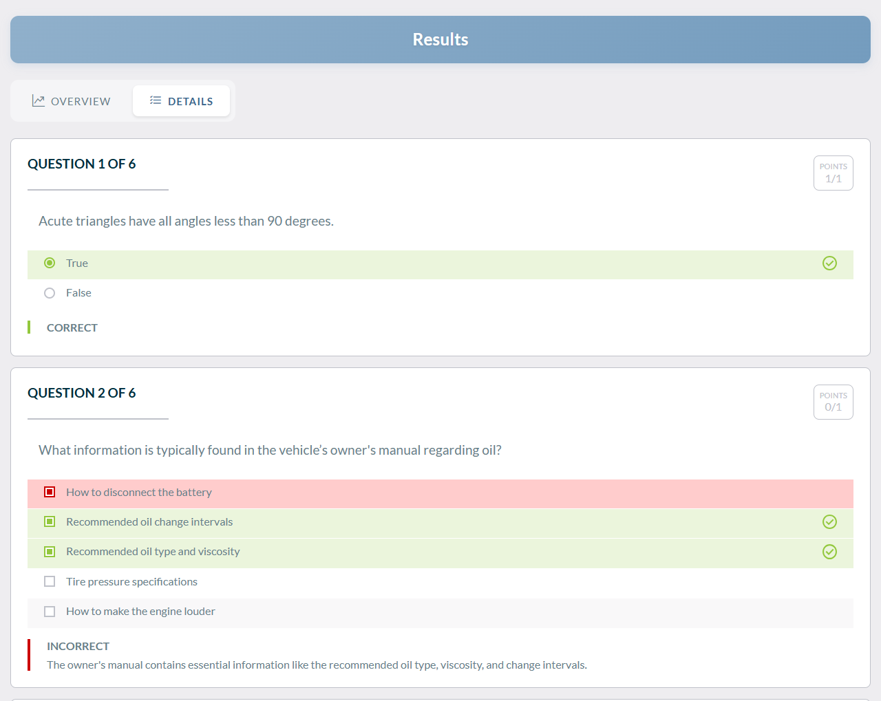 We introduced updates to assessment introductions and results pages to create a more polished and modern experience. These improvements help learners understand expectations upfront and receive clearer outcomes at completion.