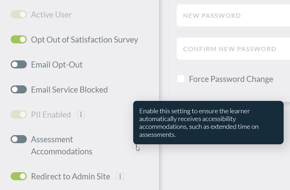 - Learner Profile Accommodation: A new toggle in learner profiles enables automatic accessibility accommodations, such as extended time on assessments. Changes are logged for auditing, and accommodations apply across LMS features when enabled.