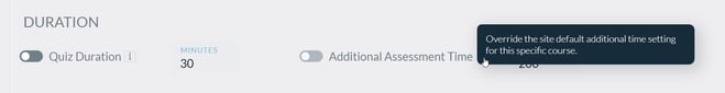 - Site-Wide and Per-Assessment Time Settings: Admins can set default additional time for assessments site-wide and override it for specific assessments. These settings ensure learners with accessibility needs receive appropriate accommodations, with all changes tracked.