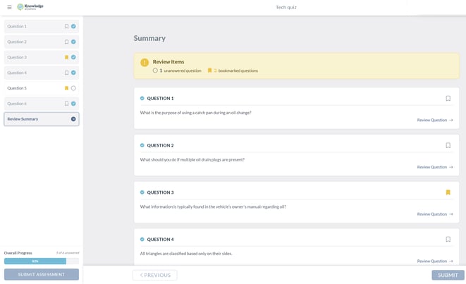 - Assessment Summary: After completing the last question, learners see a summary page listing all answered questions. The summary excludes point values and feedback, shows only selected answers, and allows navigation back to flagged questions. The summary is integrated into the Table of Contents and supports easy review before submission.