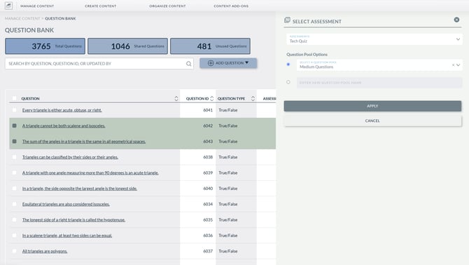- Assign Questions to Specific Pools: Within the Question Bank, admins can directly assign questions to a specific Question Pool or create a new pool within an assessment. The sidebar lists available pools, and questions are moved to the bottom of the selected pool.