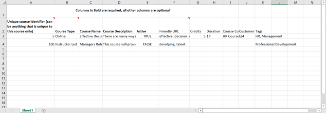 To help save time on creating courses one by one in the LMS, what you and your team can do is to fill out all the information as seen below to auto-populate your course content. The required fields are in the columns and are listed below.