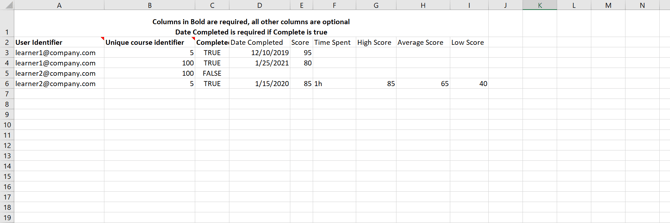 - In the “Course Completions Import Template” enter all the users in users as they were in the user import.