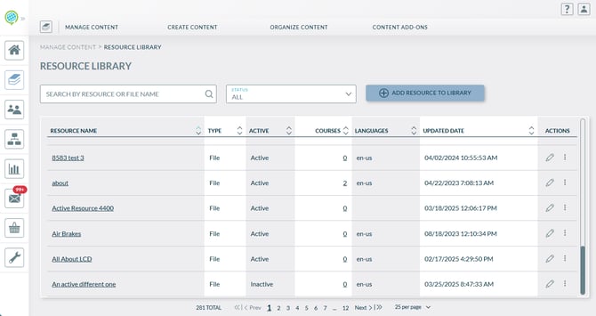 The library gives you a clear view of all your content, including resource type, language availability, and last updated date. You can edit or remove resources at any time to keep things current.
