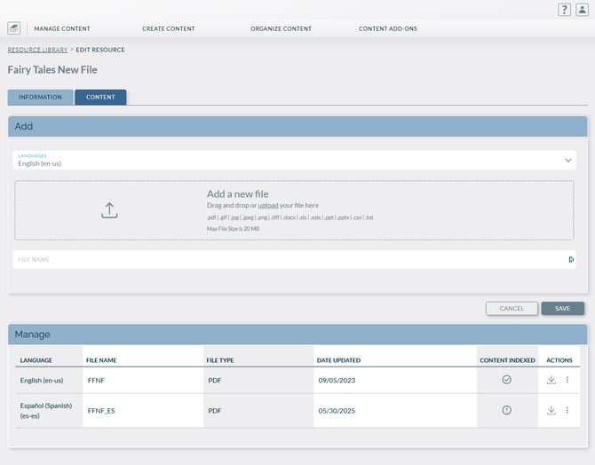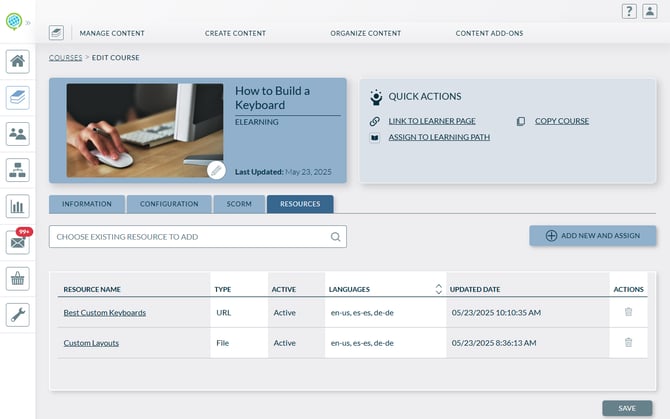 Accessed via the content section > Manage Content dropdown header, the Resource Library is a hub for supplemental materials in your LMS. It supports both file uploads and URL links, making it easy to organize and utilize materials across multiple courses for uses such as supplemental material for courses, and the Self-Study Course.